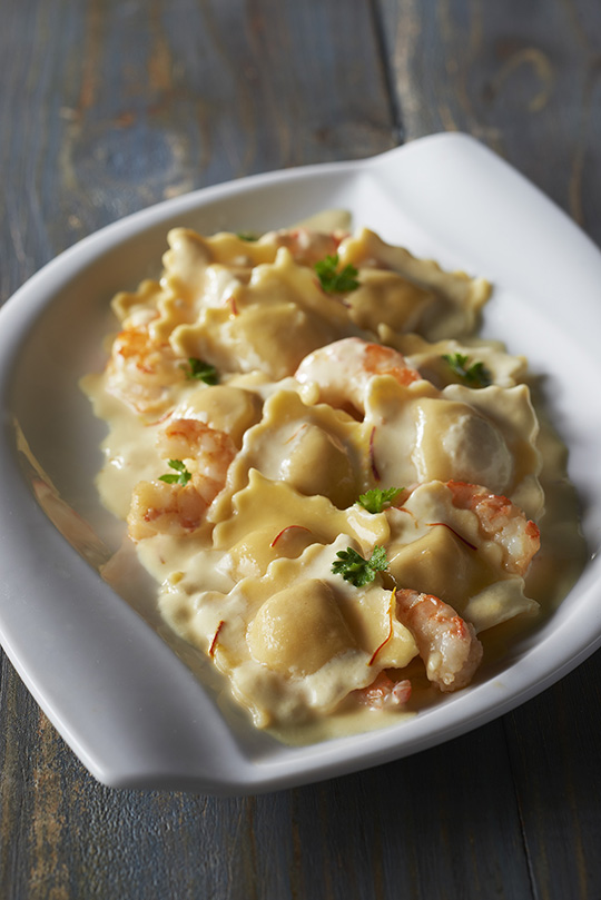 Ravioli pesto mozzarella et leur crème safranée aux crevettes sautées