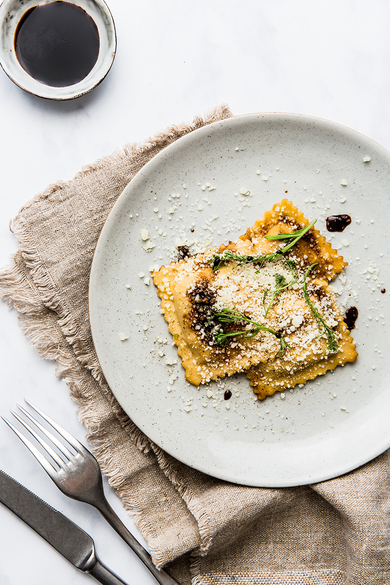 Raviolis de pommes de terre et Fiore Sardo, réduction de vinaigre Casa Maranello Bio