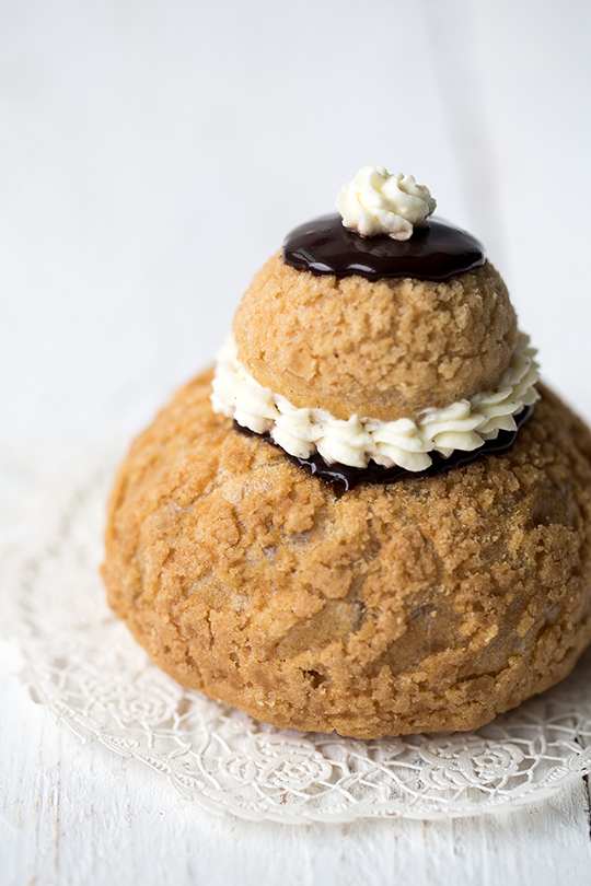 Napper le dessus de chaque chou de glaçage au chocolat et superposer un petit chou sur un grand chou.