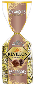 Révillon signe de sa griffe de chocolatier depuis 1898, des escargots inspirés de l’offre traditionnelle proposée par les artisans chocolatiers pendant les fêtes de Noël. En référent de la papillote haut de gamme, révillon crée les premiers escargots enveloppés en papillote, pour une présentation unique et raffinée. Riches en praliné, ils sont élaborés par les maîtres chocolatiers révillon selon le savoir-faire de la marque. une expertise qui s’exprime ici dans la variété des trois recettes de praliné noisettes, tantôt onctueux ou ponctués d’éclats de noisettes… Plus petits que les escargots traditionnels, il suffit d’une bouchée pour goûter au plaisir entier de ces escargots revisités.