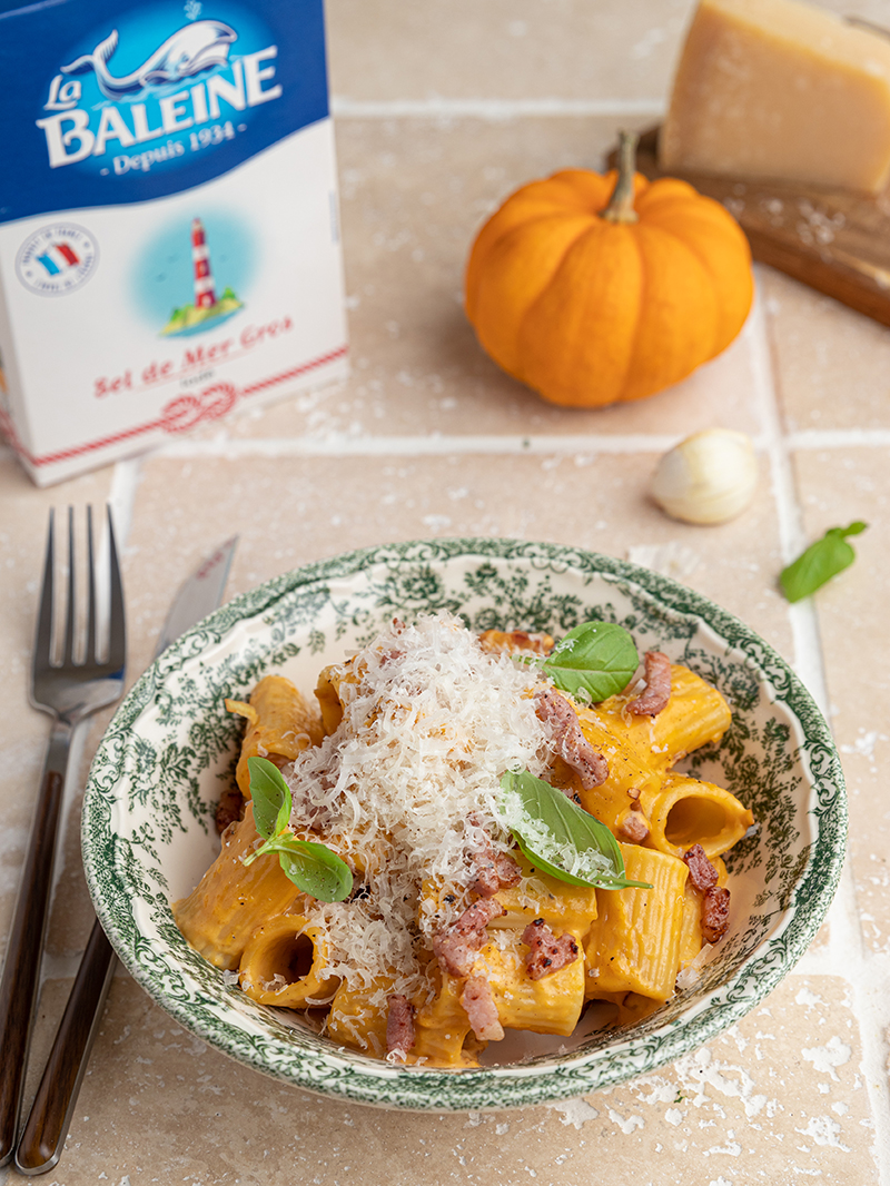 Rigatonis façon carbonara à la courge butternut
