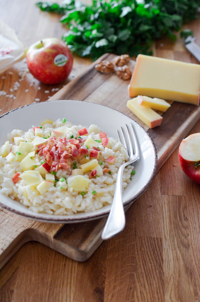 ⑤• La cuisson du risotto est terminée quand le riz a bien gonflé et est encore légèrement croquant (environ 20 minutes de cuisson). Ajoutez les ¾ du fromage râpé et laissez fondre. Coupez le feu et ajoutez la deuxième pomme coupée en dés, ainsi que la ciboulette.