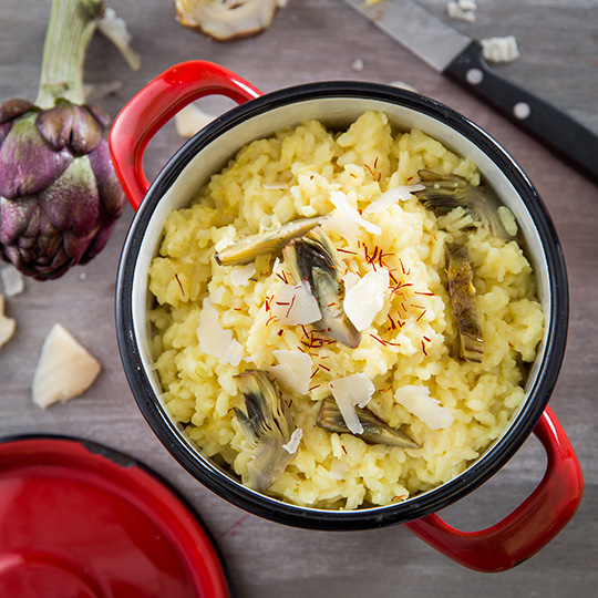 Pour obtenir un risotto plus crémeux, vous pouvez ajouter 50 g de mascarpone avant le dressage. Vous pouvez remplacer les artichauts par des cèpes.