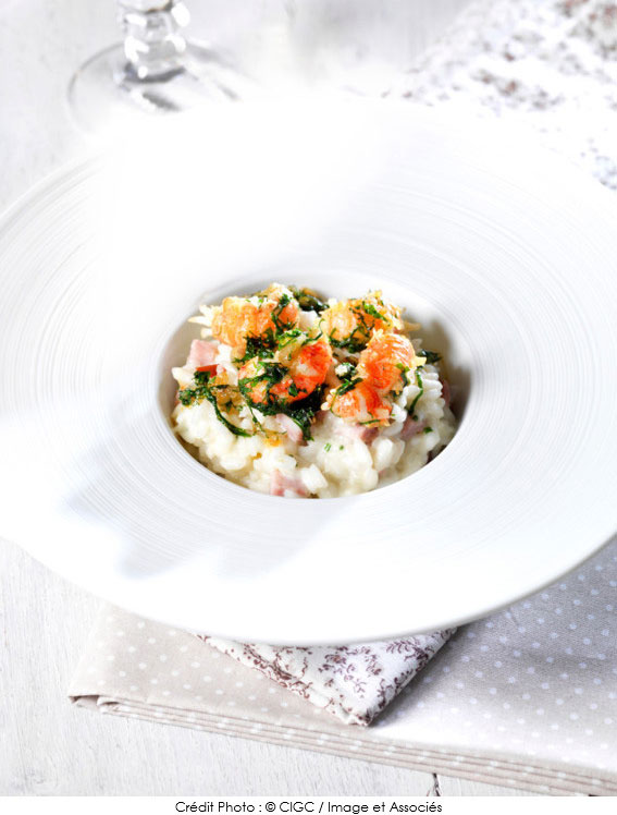 Risotto au Comté et Morteau, écrevisses aux noisettes et Vin Jaune