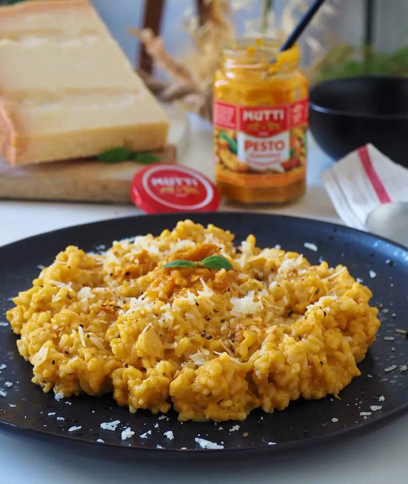Servir le risotto, en le décorant d’une petite cuillère de pesto de tomates oranges Mutti, de feuilles de basilic et de parmesan râpé.