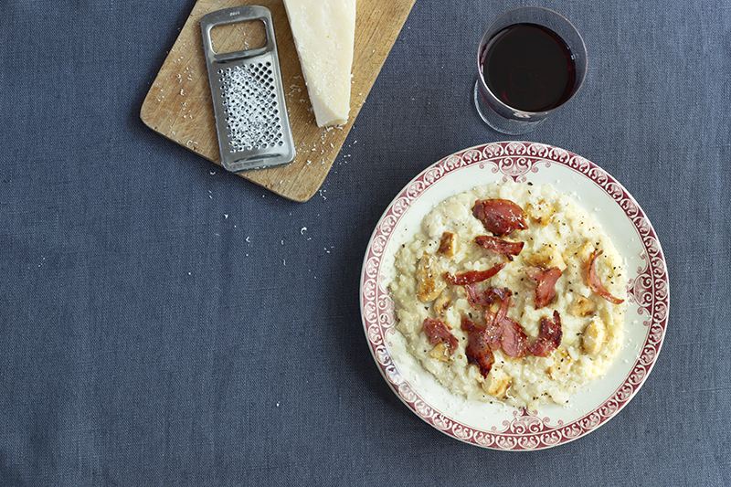 ②• Dans une sauteuse, faites revenir le poulet et la pancetta pendant 5 minutes puis réservez. Ajoutez dans la sauteuse l’oignon émincé dans 2 cuil. à soupe d’huile d’olive, ajoutez le riz et mélangez avec une cuillère en bois jusqu’à ce que le riz devienne translucide.