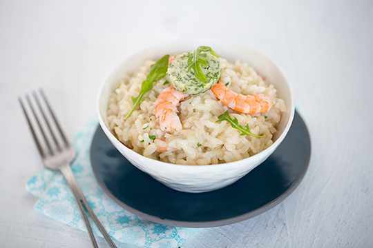 Servir le risotto dans des assiettes chaudes avec le reste des crevettes et des rondelles de beurre comté-roquette.