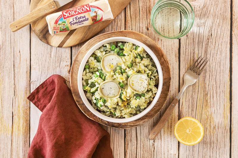 Un risotto crémeux et ensoleillé où petits pois, courgette et Bûche de chèvre SOIGNON se marient avec fraîcheur et douceur pour une assiette pleine de légèreté.