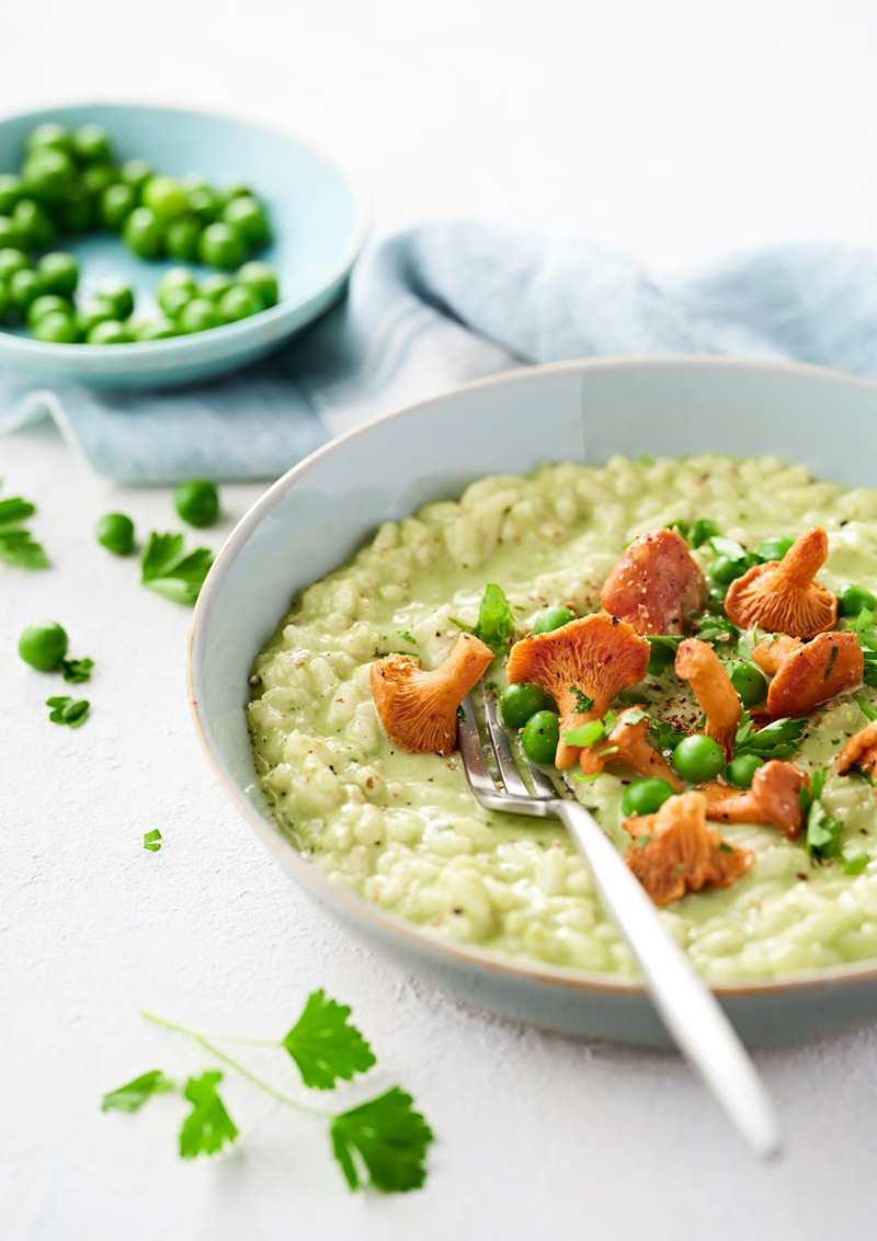 ⑥• Environ 5 minutes avant la fin de la cuisson du risotto, ajoutez les girolles et le reste des petits pois entiers.