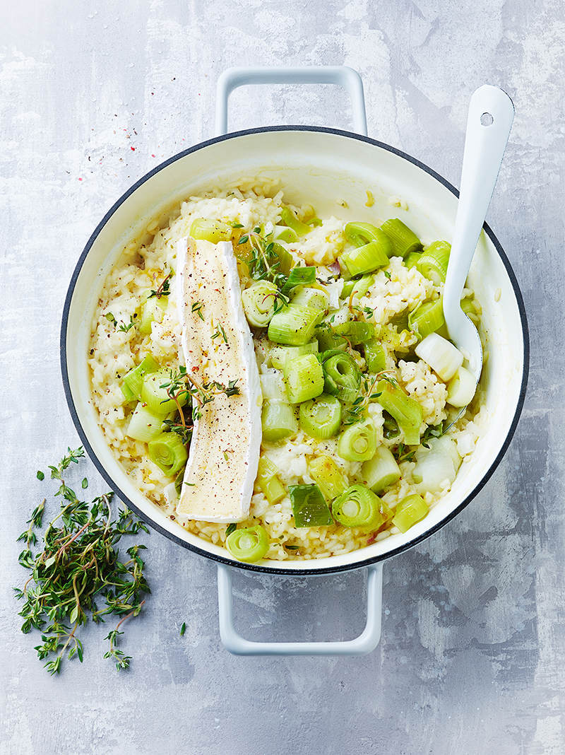 ③• Pendant ce temps, lavez les poireaux et émincez-les en rondelles de 2 cm. Faites-les revenir à feu doux dans une autre poêle avec 30 g de beurre et le thym, jusqu’à ce qu’ils soient tendres. Ajoutez-les au risotto à la fin de la cuisson avec le fromage frais, mélangez, couvrez et laissez reposer 2 min. hors du feu.