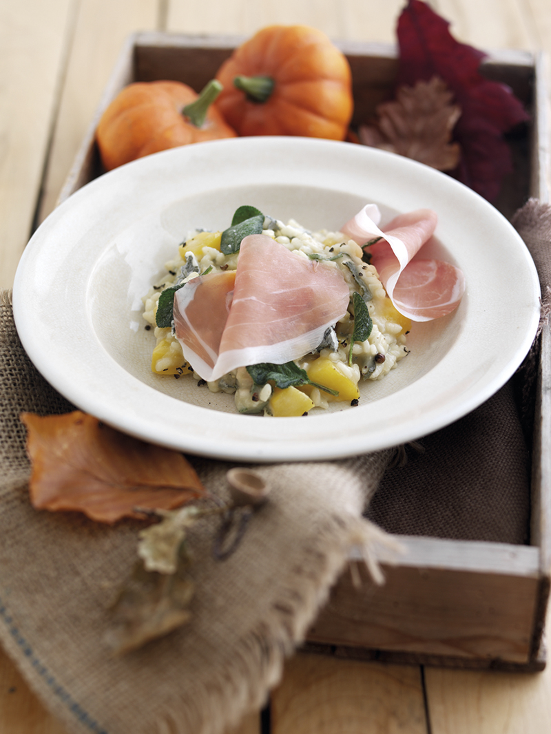 Risotto d’automne : Jambon de Parme, potiron, gorgonzola et sauge