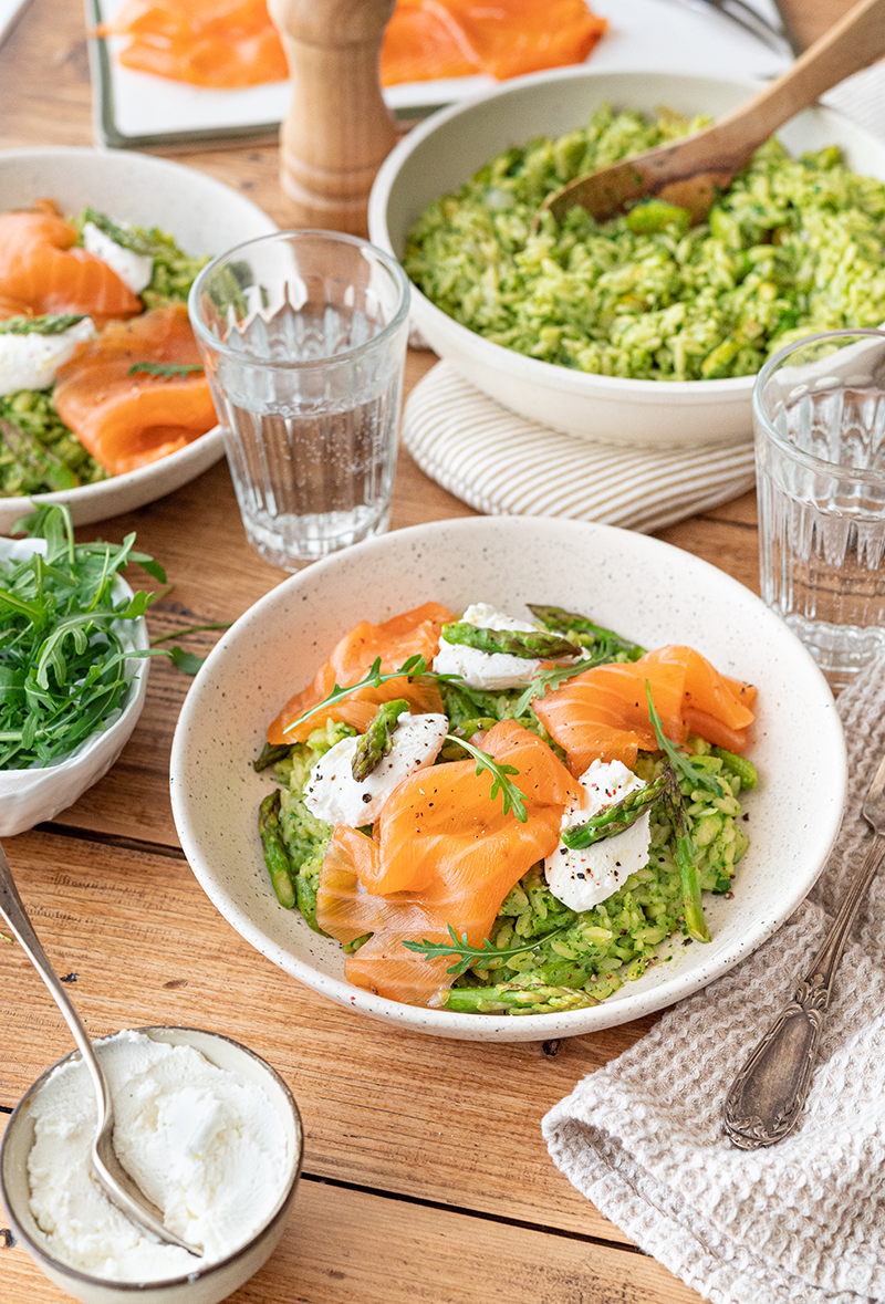 Servir le risotto en ajoutant des quenelles de chèvre frais, des têtes d’asperges, un filet d’huile d’olive, de belles tranches de saumon fumé et un peu de roquette.