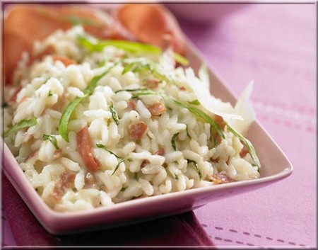Assaisonnez avec la muscade, ajoutez la roquette et le jambon chaud en lanières sur le risotto et servez immédiatement !