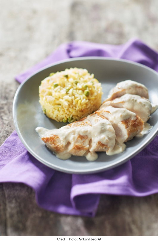 Servir le riz accompagné des filets de poulet nappés de la sauce au fromage blanc.