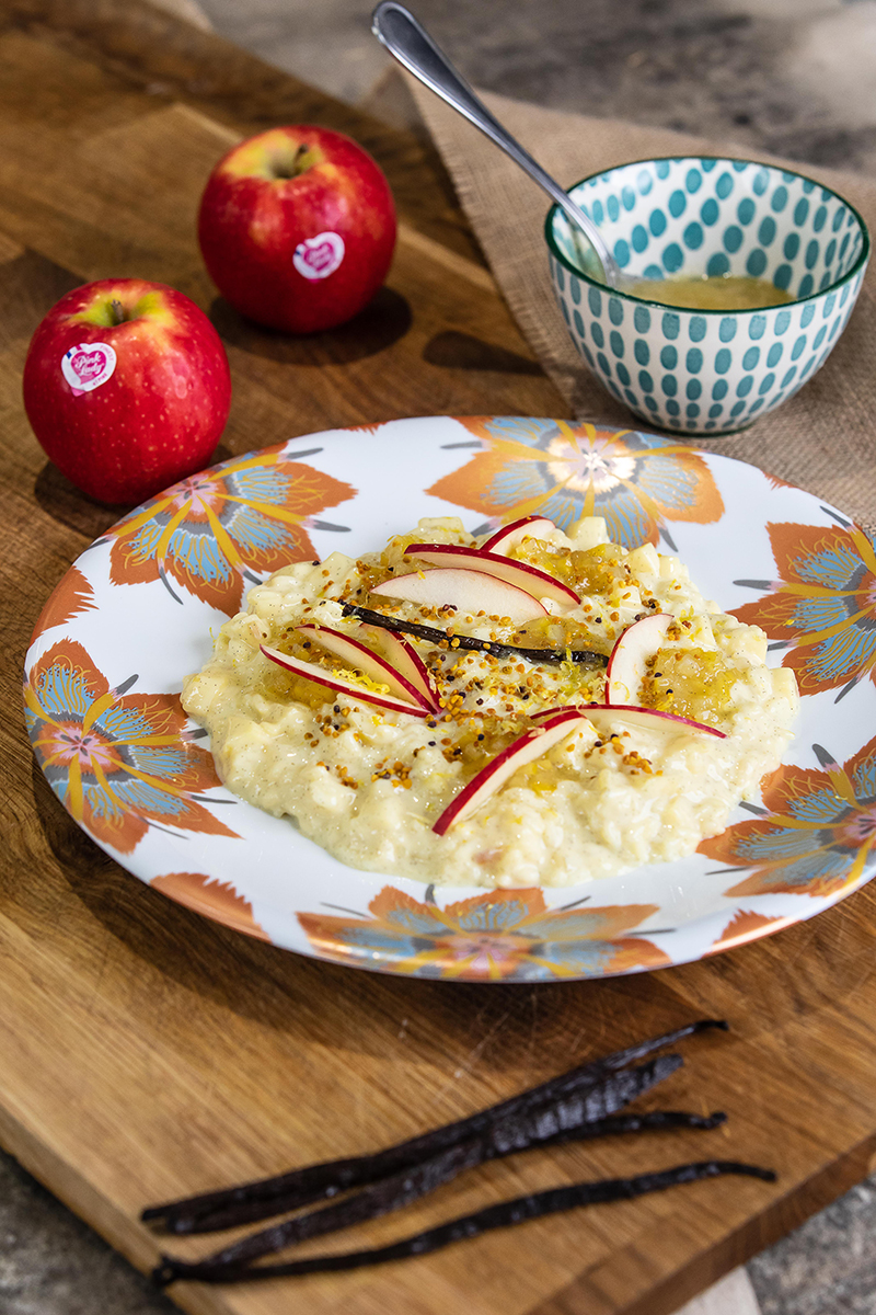 ⑥• Dressage : dresser le riz au lait comme un risotto dans une grande assiette. Quelques points de compotée de citron. La julienne de Pink Lady® nature et le pollen à volonté comme si c’était du Parmigiano.
