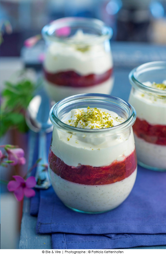 ⑤• Répartir la crème de pruneaux sur le riz au lait froid et y déposer une cuillère de crème. Saupoudrer avec les pistaches.