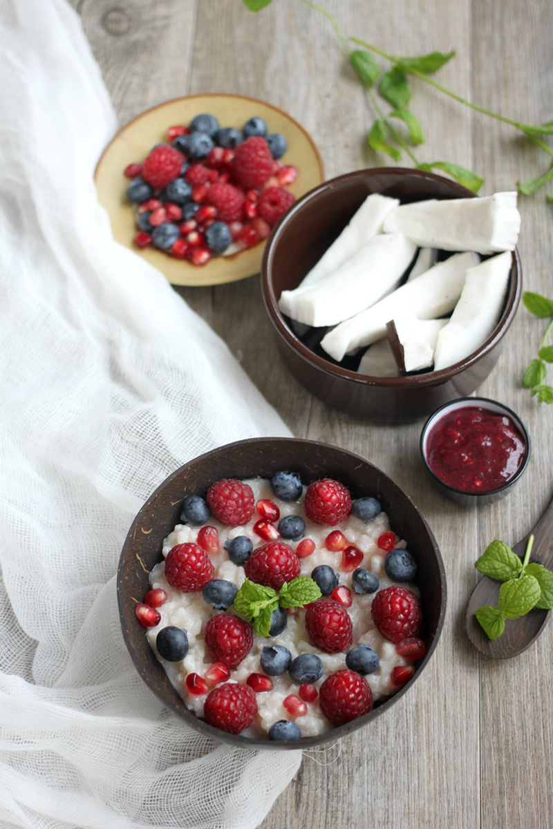 Riz au lait de coco maison et Superfoods (grenade, myrtilles et framboises)