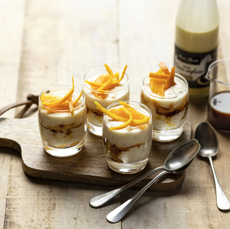 ⑧• Dans une verrine, dresser successivement quelques quartiers d’orange, le Riz au lait à la vanille de Madagascar Marie Morin, le caramel et une dernière couche de riz au lait.