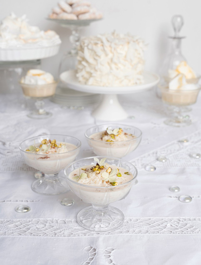 ④• Au moment de servir, versez le riz au lait dans des coupes individuelles, parsemez de pistaches et saupoudrez de cannelle.