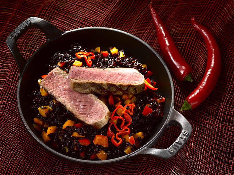 Quand le riz est cuit, rectifier l’assaisonnement si besoin, ajouter les poivrons et l’entrecôte coupée en tranches de 2 cm d’épaisseur.