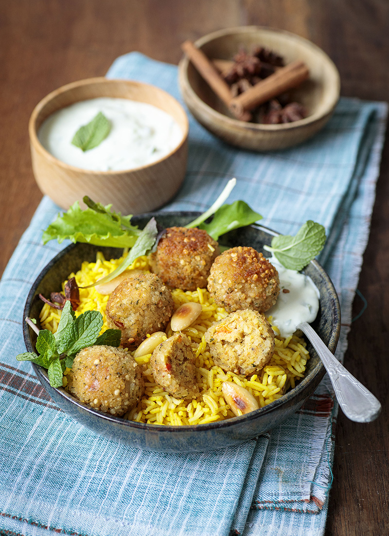 Riz jaune sauce Raïta et boulettes de lentilles