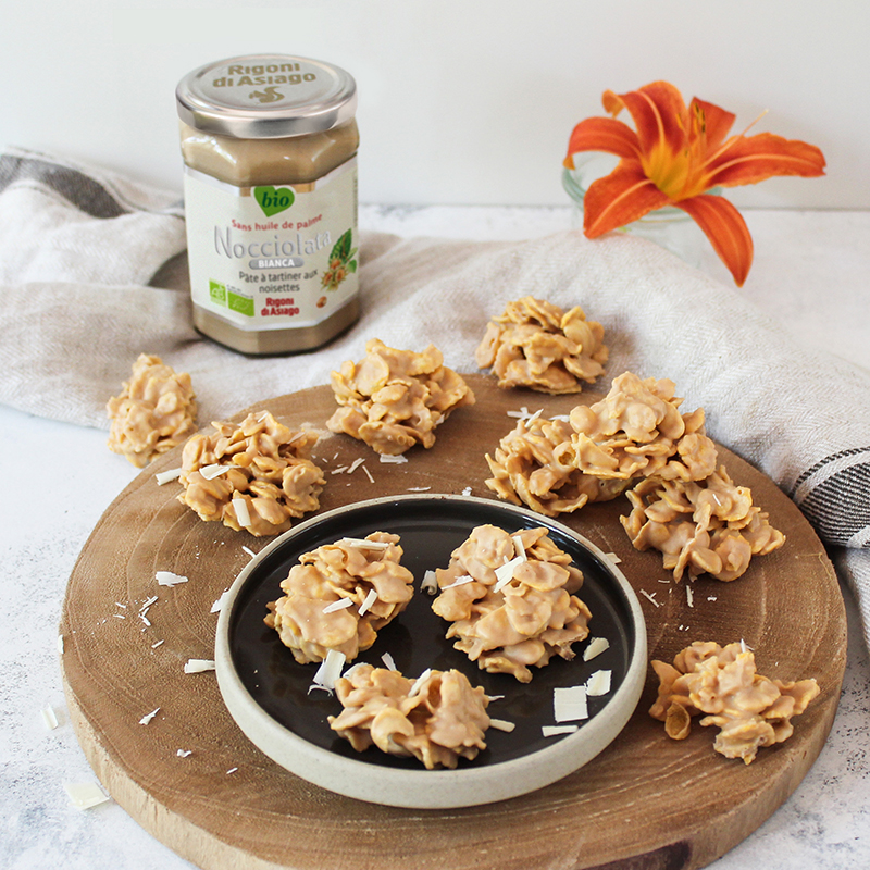 De fins pétales de maïs croustillants enrobés d’un onctueux chocolat blanc à la Nocciolata Bianca !
