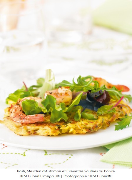 Rösti, Mesclun d’Automne et Crevettes Sautées au Poivre