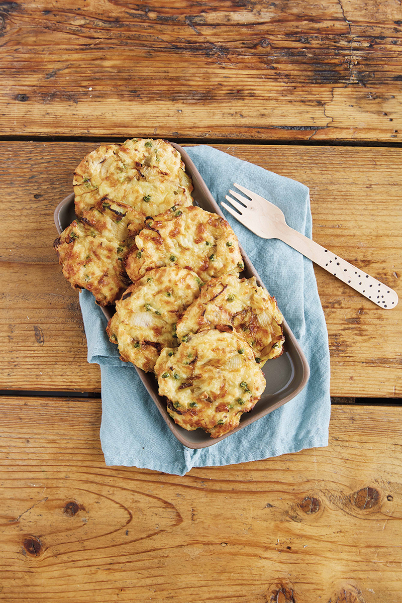 ⑤• À l'aide d'une cuillère en bois, mélangez puis ajoutez l’œuf et la fécule de maïs. Mélangez de nouveau et ajoutez les petits pois, l'emmental ainsi que la mozzarella. Travaillez une dernière fois ce mélange puis formez 4 boules.