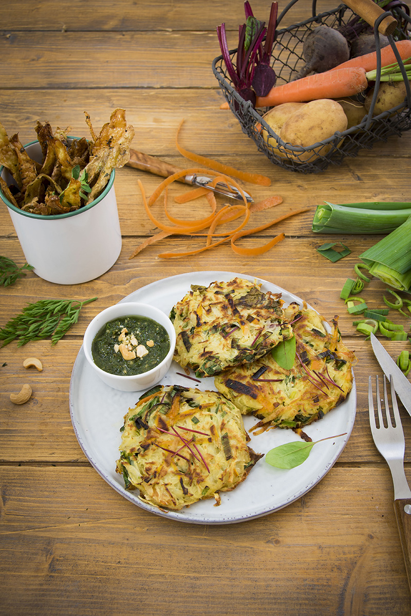 Röstis aux épluchures, pesto de fanes de carottes et chips d’épluchures de pommes de terre