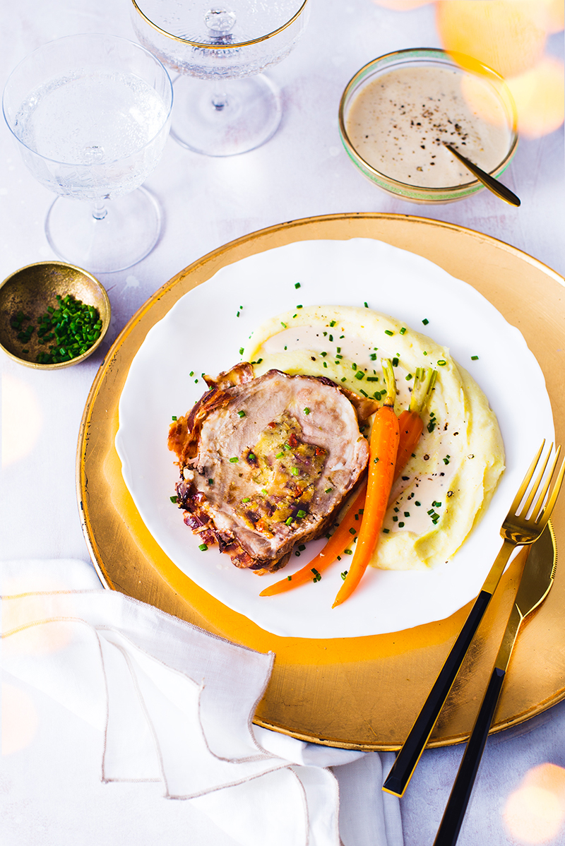 Servez le rôti tranché avec la sauce accompagné d’une purée de pommes de terre et des petites carottes poêlées au beurre.