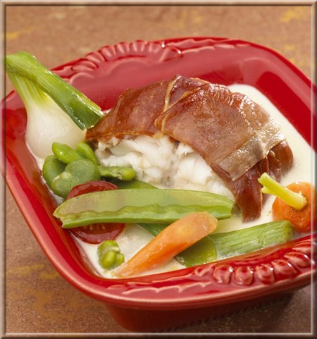 9.Envelopper la queue de lotte dans les tranches de jambon. Ficeler. Placer dans un plat du four, badigeonner d’huile d’olive. Enfourner et cuire 10 à 15 minutes.