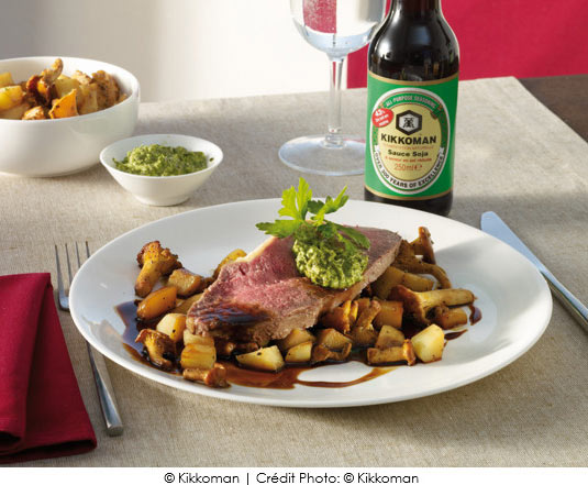 Rôti de Bœuf garni de pommes de terre et champignons au pesto, sauce soja Kikkoman