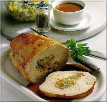 3- Poser le rôti de dinde sur le plan de travail. L'ouvrir et étaler la farce. Rouler et ficeler. Le poser sur un plat à four et l'enduire de beurre. Saler, poivrer.