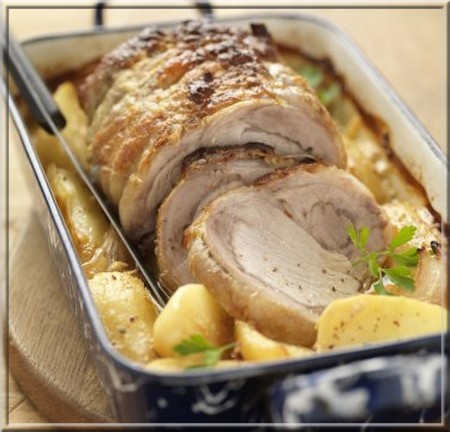 Trancher le rôti et le servir accompagné des pommes de terre aux oignons.