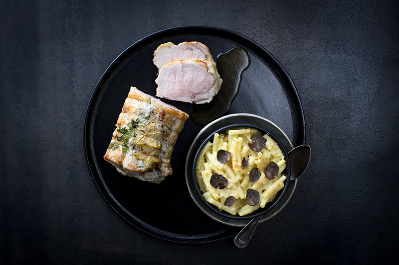 Rôti de porc au beurre truffé, macaronis aux truffes