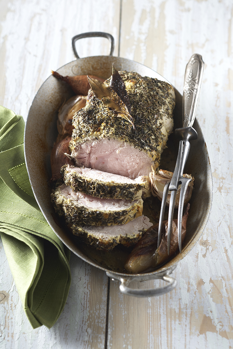 Servir le rôti découpé en tranches épaisses accompagnées d’une purée de pommes de terre et du jus de cuisson en saucière.