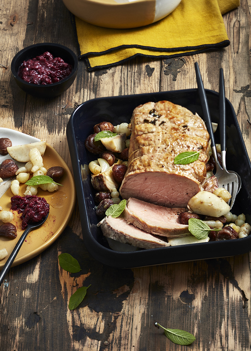 Rôti de veau à la sauge mijoté de crosnes, topinambours, châtaignes et compotée d’airelles
