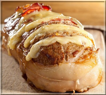 2.Puis inciser profondément le rôti en 8 endroits. Glisser une tranche de bacon et une tranche de Comté dans chaque incision. Réserver le rôti. Préchauffer le four à 180°C (th. 7).