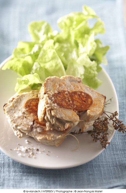 Pour être plus festif : envelopper complètement de tranches de jambon cru le rôti farci avant de le ficeler