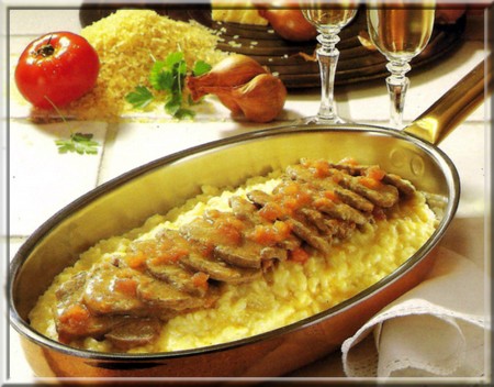 Tapisser de riz le fond d'un plat. Couper le rôti en tranches, les déposer sur le riz. Napper de sauce de cuisson.