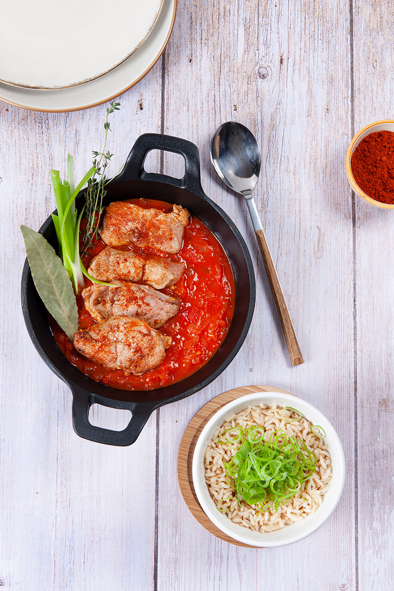 • Étaler la sauce rougail dans le fond de l’assiette. Déposer les tranches de gigot de chevreau par-dessus.