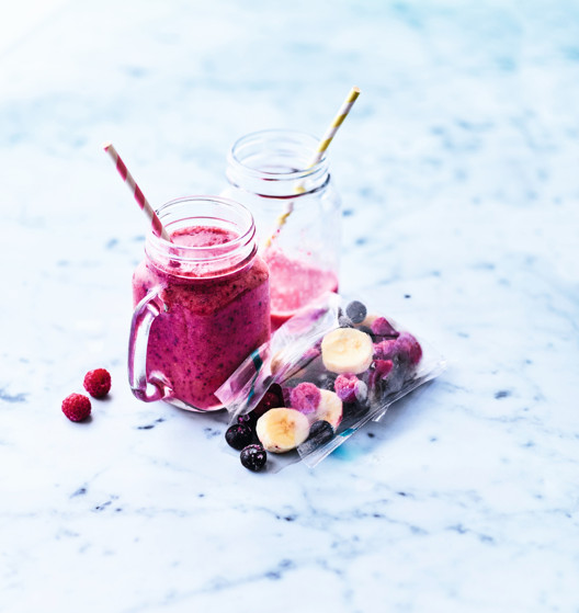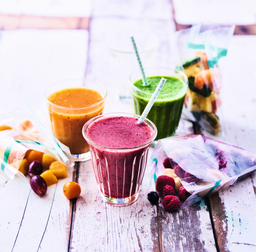 Ces trois cocktails de fruits se mixent, selon les moments et les envies, avec 125 ml de jus de fruits, de lait, de laits végétaux, d’eau de coco ou de yaourt brassé… Il suffit de laisser parler son imagination.