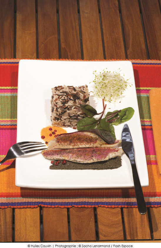 ⑤• Présentation : Déposer immédiatement les rougets sur une assiette, avec une noix de tapenade, du riz, une cuillère d’émulsion, parsemer de baies roses.