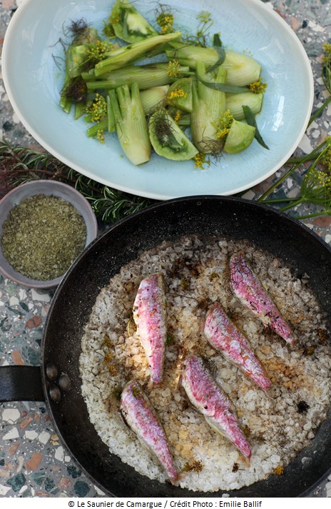 L’Astuce du Chef : « La cuisson des rougets sur le gros sel cristaux bruts de Camargue offre une chair exceptionnellement tendre mais également assaisonnée en profondeur.