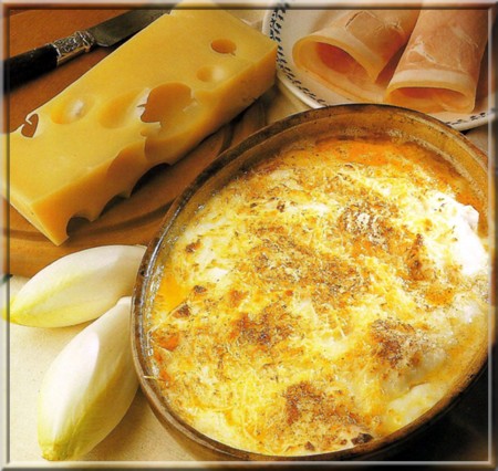 8. Roulez les endives dans les tranches de jambon, disposez-les dans un plat à gratin et recouvrez de béchamel.