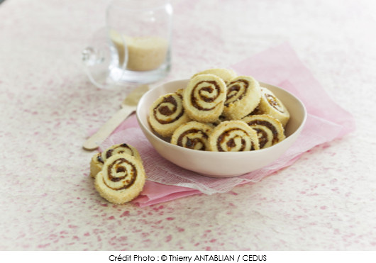 ⑧• Couper le rouleau en tranches d’1 cm environ et déposer les roulés sur une plaque recouverte de papier cuisson.