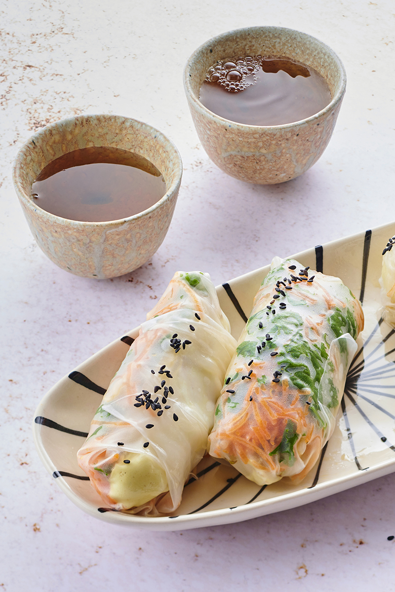 ⑤• Humidifiez un torchon propre et étalez-le sur le plan de travail. Remplissez une assiette creuse d’eau froide puis faites tremper une feuille de riz jusqu’à ce qu’elle soit ramollie.