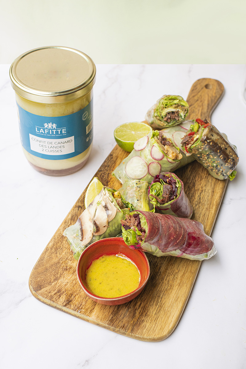 Placer 1 ou 2 feuilles de salade, quelques champignons et radis émincés finement et quelques feuilles de menthe et de coriandre fraîches. Déposer une petite quantité de vermicelles au centre de la feuille de riz. Ajouter les cuisses confites effilochées Maison LAFITTE et une pincée de graines de sésame grillées. Plier la partie du bas par-dessus les ingrédients et presser légèrement avec vos doigts pour compacter. Plier ensuite les côtés par-dessus le centre et rouler le tout vers le haut.