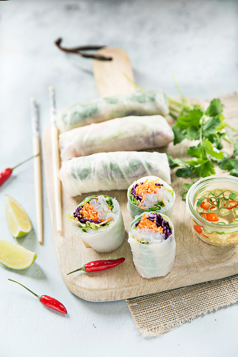 Servir les "rouleaux de printemps" avec la sauce nuoc-mâm.