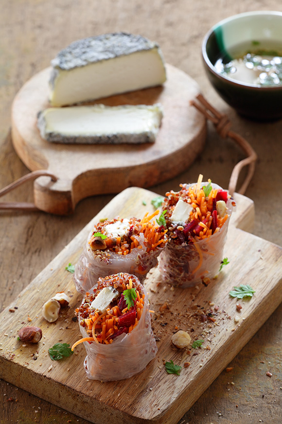 ⑤• Faire tremper une première feuille de riz dans un grand bol d’eau fraîche afin de la ramollir. Étaler la feuille sur un torchon propre humide. Déposer une petite quantité de carottes et de betteraves au centre de la feuille de riz. Ajouter du quinoa et une belle tranche de Selles-sur-Cher AOP.